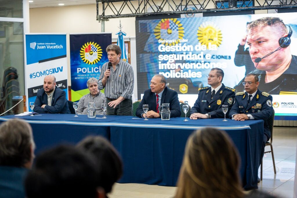 17 Octubre 2025.- Con el objetivo de fortalecer las capacidades institucionales en materia de seguridad, se dio inicio esta mañana al Seminario-Taller «Gestión de la Seguridad e Intervenciones Policiales», una iniciativa académica impulsada conjuntamente por el Gobierno de la Provincia de Tierra del Fuego, Antártida e Islas del Atlántico Sur, la Municipalidad de Ushuaia, la Policía Provincial y el Instituto Universitario Juan Vucetich.