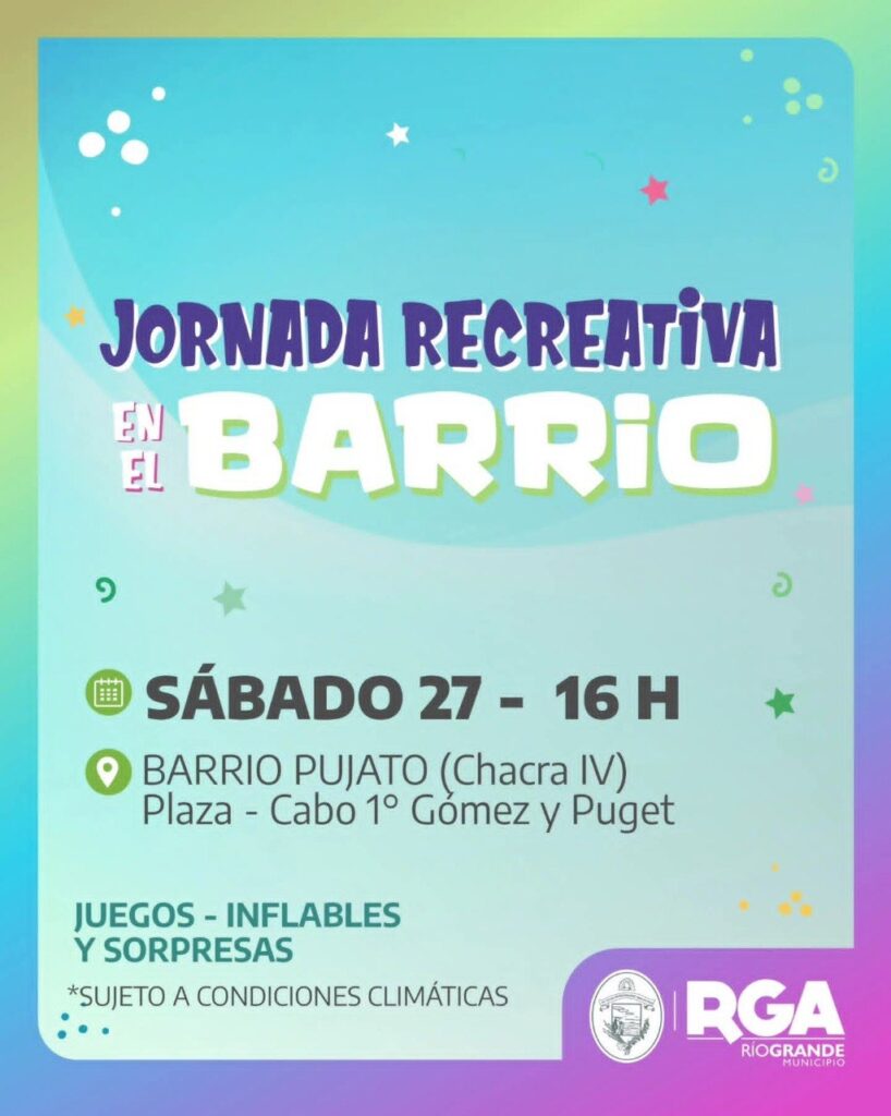 26 Diciembre 2025.- Con el objetivo de acercar el deporte y la recreación a cada barrio de la ciudad, el Municipio de Río Grande invita a la comunidad a participar de la Jornada Recreativa en el Barrio. La misma será el sábado 27 de diciembre en la plaza ubicada en Cabo 1º Gómez y Puget del B° Pujato (Chacra IV).
