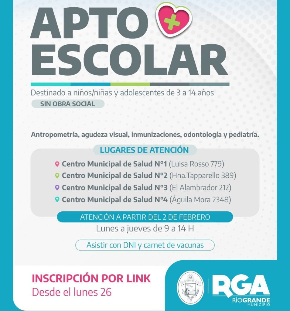 El Circuito de Aptitud Escolar y Control de Niño Sano comenzará el lunes 2 de febrero y se realizará de lunes a jueves, de 9 a 14 horas, en los cuatro Centros de Salud Municipales. Las inscripciones se habilitarán a partir del lunes 26 de enero; próximamente se informará el formulario para que las personas interesadas puedan anotarse.