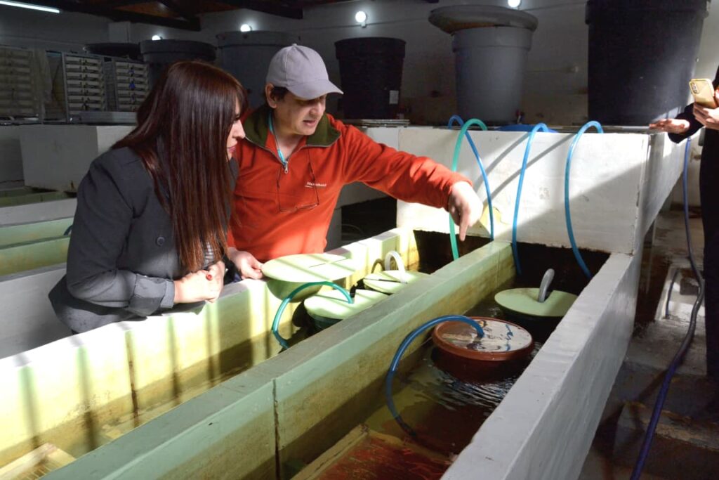 En la Estación, la Ministra Fernández junto al subsecretario de Coordinación Pesquera y Acuícola, Diego Marzioni, y la secretaria de Coordinación General, Lorena Rodríguez, supervisaron los avances en infraestructura, así como los trabajos en genética y control ambiental, que forman parte de las acciones para impulsar el desarrollo sostenible de la acuicultura y la pesca en la provincia.